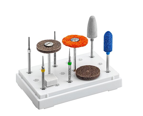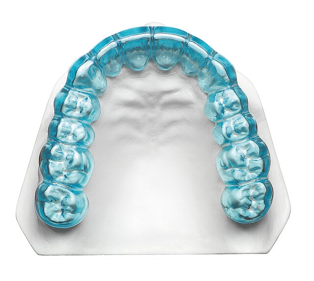 Gipsmodelle sollten so ausgearbeitet sein, dass sie einen guten Schienensitz gewährleisten. Achten Sie deshalb grundsätzlich darauf, vor dem Tiefziehen negative Blasen am Modell (bedingt durch fehlerhaftes Ausgießen) mit Gips, Silikon oder Kunststoff auszublocken und positive Bläschen (z.B. an Cervikalrand oder Interdentalräumen) mit einem Instrument zu entfernen. Bringen Sie Höhe und Ränder des Modells mit einem Trimmer in Form und glätten Sie scharfe Kanten mit einem Gipsmesser oder mit einer Gipsfräse. Unterschnitte sind vor dem Tiefziehvorgang auszublocken, hierfür eignen sich lichthärtende Ausblockkunststoffe (z. B. BLUE-BLOKKER®) oder Ausblocksilikon (z. B. SIL-KITT). Nicht geeignet ist Wachs, da es beim Kontakt mit dem erwärmten Tiefziehmaterial schmelzen kann.