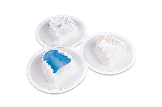 Wenn Sie harte Materialien tiefziehen möchten, kann es beim Entformen der Folien zum Abbrechen der Zähne kommen, deshalb empfehlen wir die Verwendung von Duplikatmodellen. Ziehen Sie ISOFOLAN® als Isolierung tief, schneiden die Folie am Modellboden ab und perforieren sie interdental. Betten Sie das Modell dann in Granulat ein, um einen zu langen Streckweg der Folie zu vermeiden. Die Frontzähne sollten je nach Indikation entweder zur Schwenkachse oder zur Verschlusswelle zeigen, damit sich die Folie optimal adaptieren kann.