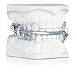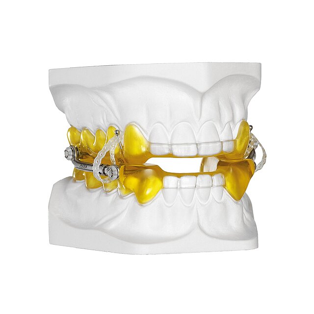 Intraorales Schnarchtherapiegerät, Herstellung im Tiefziehverfahren. Die Verbindung von Ober- und Unterkiefer erfolgt durch ein stufenlos verstellbares HF-Teleskop. Der Unterkiefer und somit auch die Zunge werden durch Protrusion nach vorne verlagert.