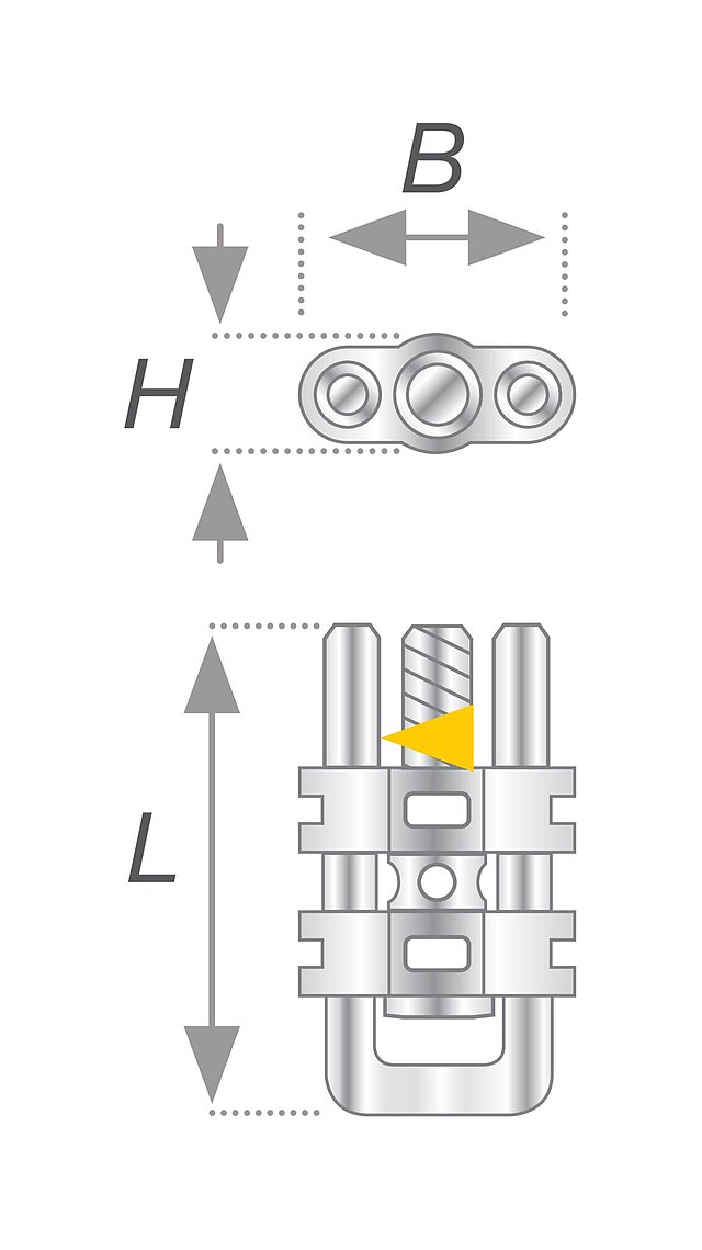Skelettierte Sektoren-Dehnschraube mit leuchtgelbem Drehrichtungspfeil in Miniaturbauweise für Einzelzahnbewegungen und Segmentbewegungen im Ober- und Unterkiefer.