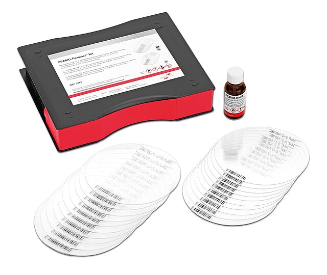 Das Kit enthält 10 IMPRELON® S pd Folien (0,75 x 125 mm), 10 BIOPLAST® Folien (1,5 x 125 mm) und 10 ml OSAMU-Bond zur Herstellung von 10 Retainern. Alle Bestandteile sind auch einzeln erhältlich.